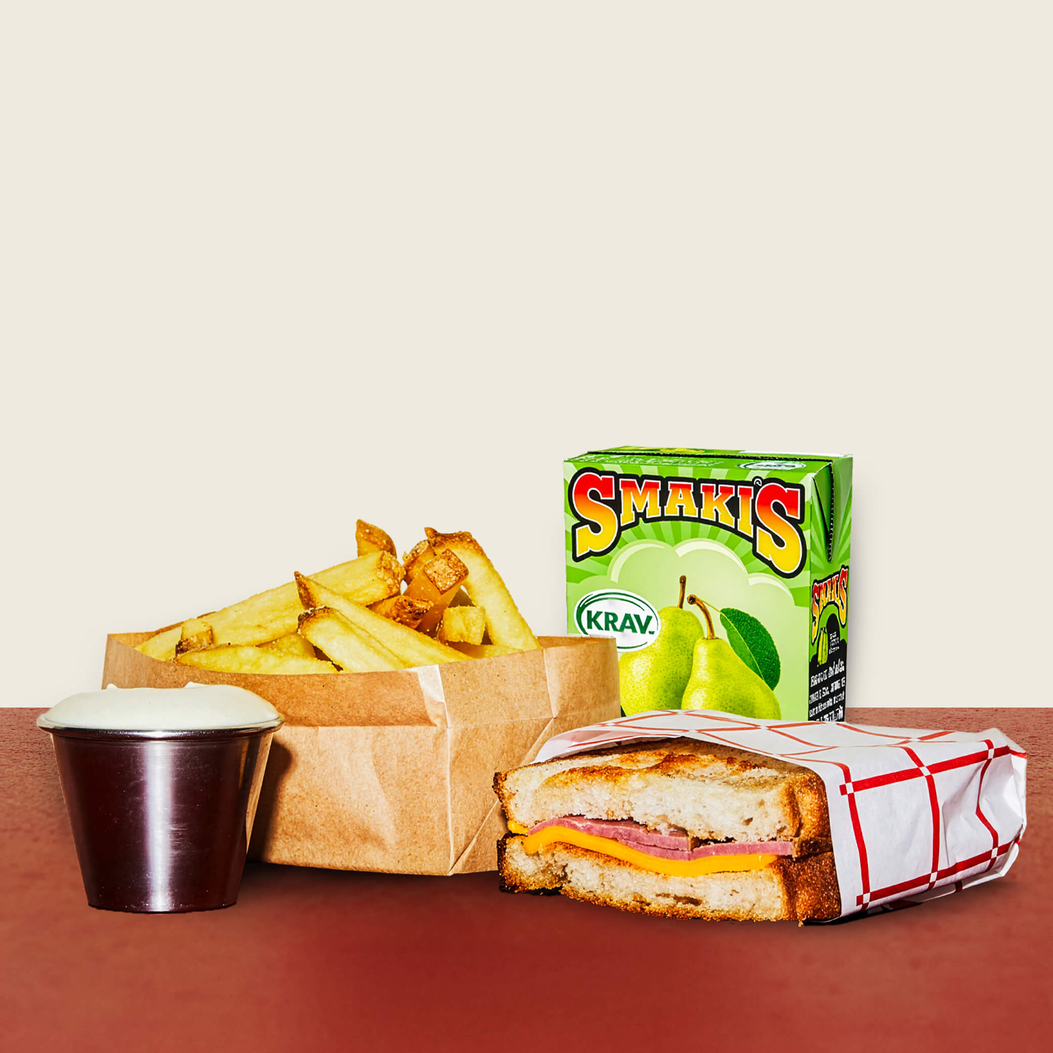 Ost & oxbringamacka med pommes, dipp & smakis + glass.