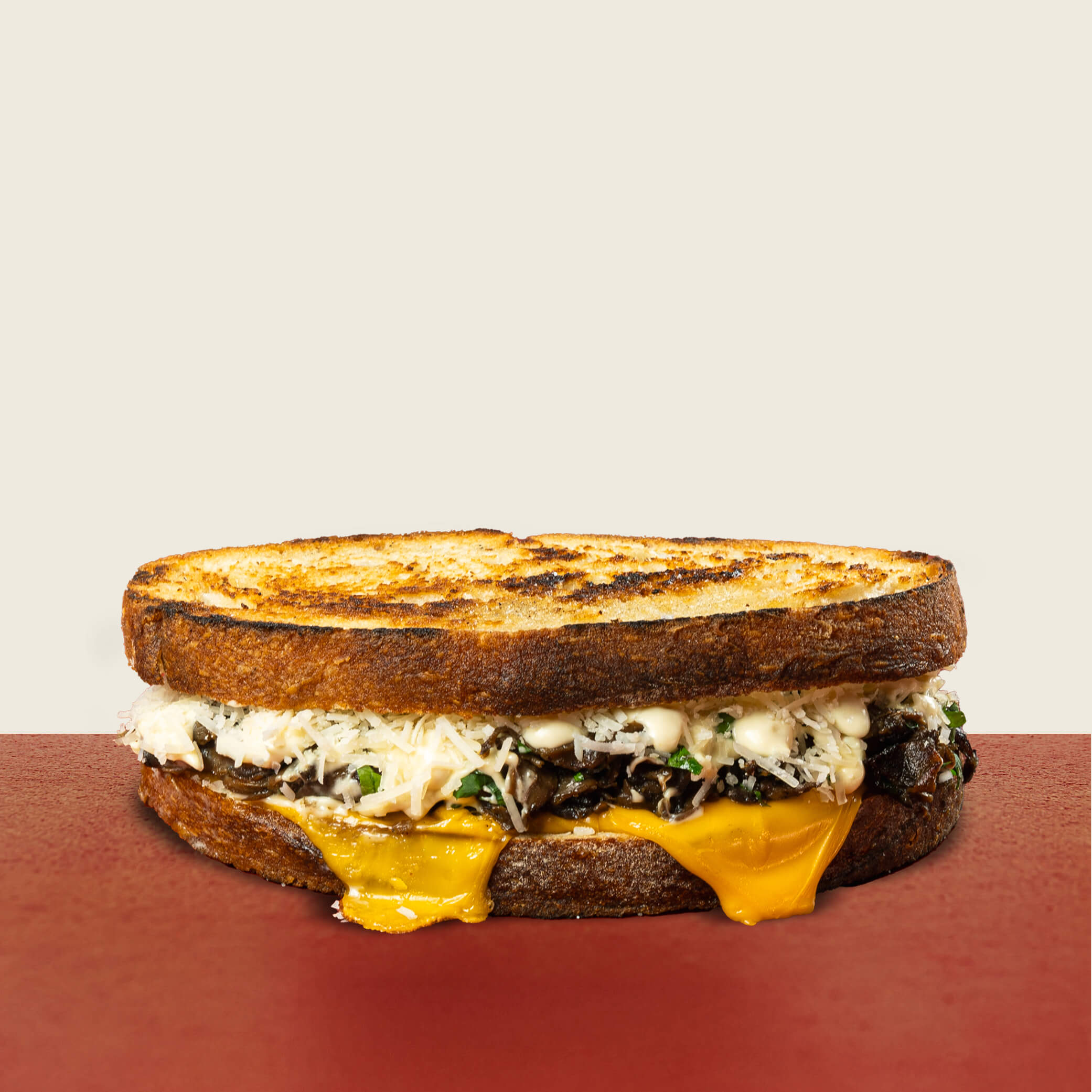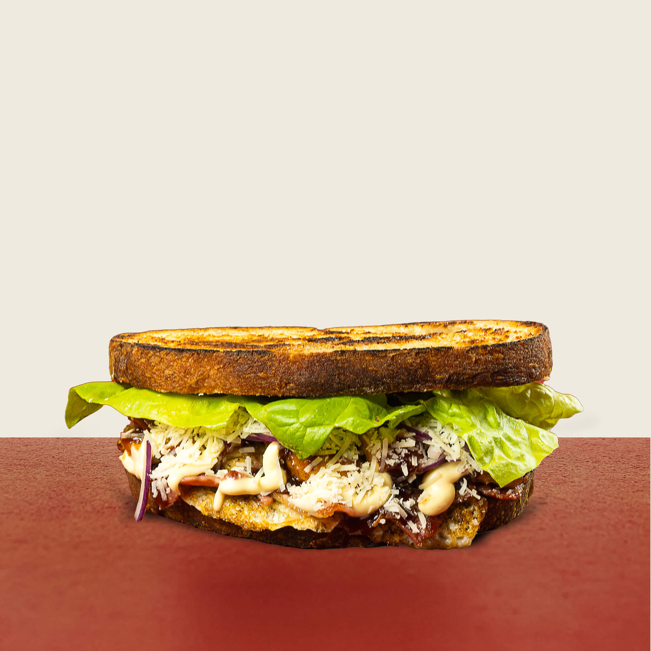 med parmesan, bladsallad, rödlök, majonnäs & persilja
