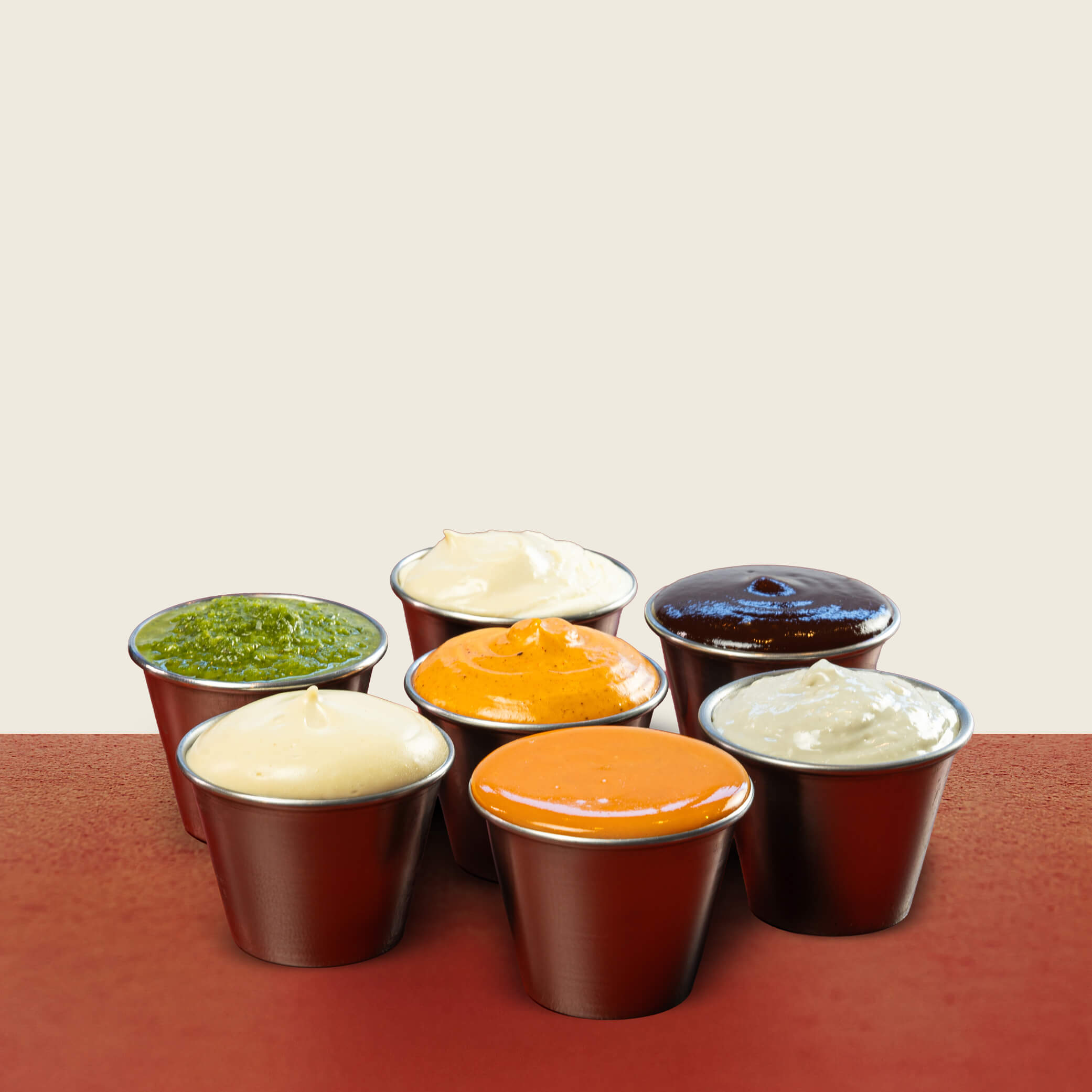 Svartpepparmajonnäs, Majonnäs, Majonnäs (vegansk), BBQ-sås, Jalapeñosalsa, Sourcream (laktosfri), Blåmöggelost, Hot Sauce.